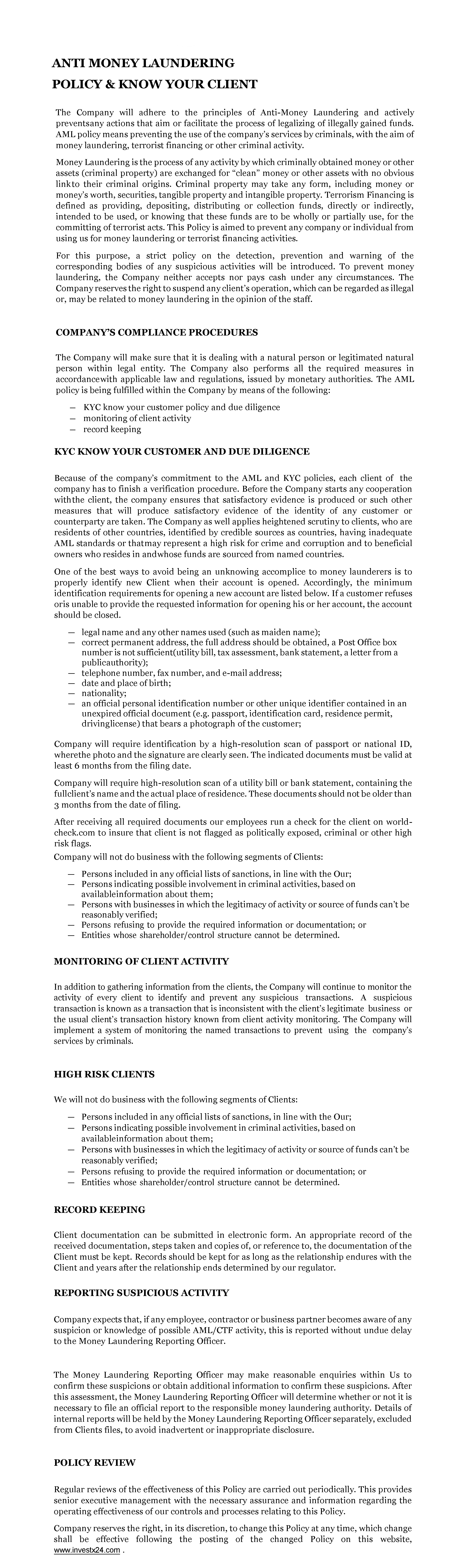 Anti Money Laundering Policy & Know Your Client